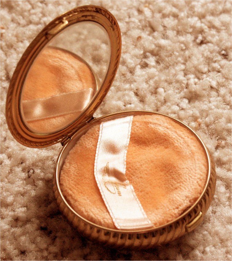 The compact, pictured at left, was covered in the same material as the purse and allowed the buyer to fill it with whatever powder she preferred.