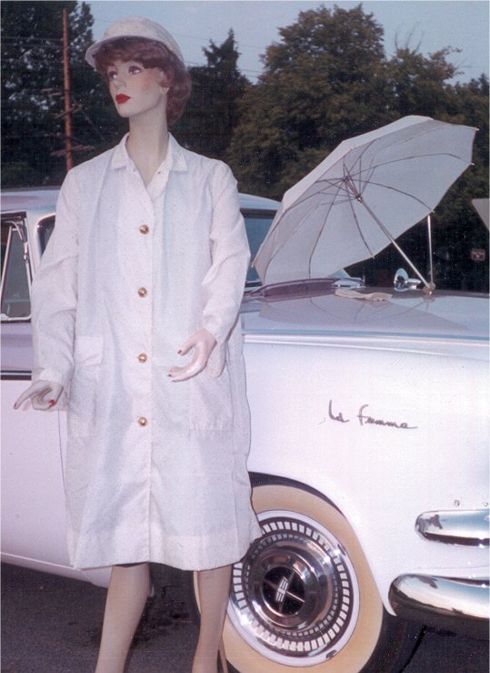 In 1956, Dodge once again presented accessories to La Femme buyers. This time, however, they opted to go without a special purse and instead only offered the rain gear, this time in a different pattern and featuring a baseball cap style rain hat, as shown at right.